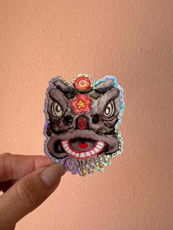 This black lion dance glitter vinyl sticker was created from a hand-painted watercolor illustration by Kathy Phan from kathyphantastic.