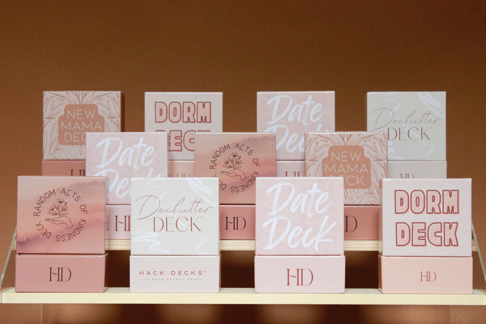 Having created our Declutter Deck®, we then found that there were other areas of life to tackle. Primarily, our Hack Decks™ focus on topics that can easily lead to anxiety and isolation. These include transitioning into motherhood, going off to college, visual clutter and disorganization, date night ideas that help couples connect, and community impact. Our decks are different from typical affirmation cards or prompt cards. Hack Decks™ empower users not only to think positively, but act on their own behalf to improve their lives. Our prompts encourage users to establish healthy habits that last, while fostering connection to others and themselves.
