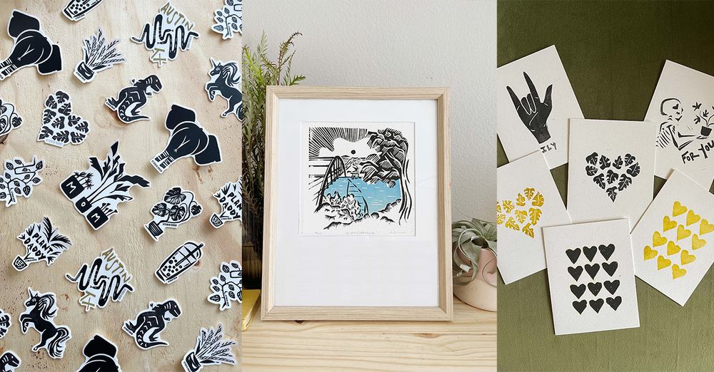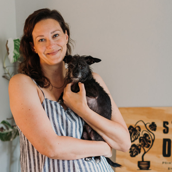 As a landscape architect by day, she is inspired by the botanical and natural world, city views and her studio assistant chihuahua, Ichabod. She has a love for simple and handmade art and designs prints through both digital illustration and block printing methods. She creates a variety of linocut relief prints that she draws, carves out of linoleum, and prints by hand with oil based inks. Her notecards are handmade with the same block printing process on Kraft-tone paper that she cuts and scores from scratch. This printing process makes each note card unique gifts by hand or mail and are frameable art in their own right. Ellen loves block printing because of the tangible feel of the medium and the unpredictable end result. She loves to see her art on the walls of people she loves.